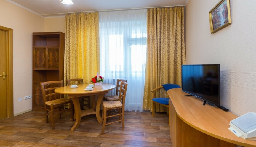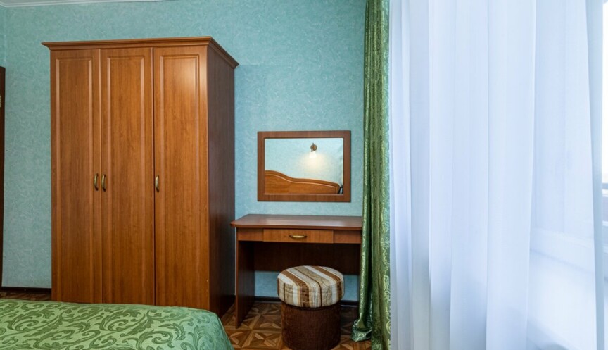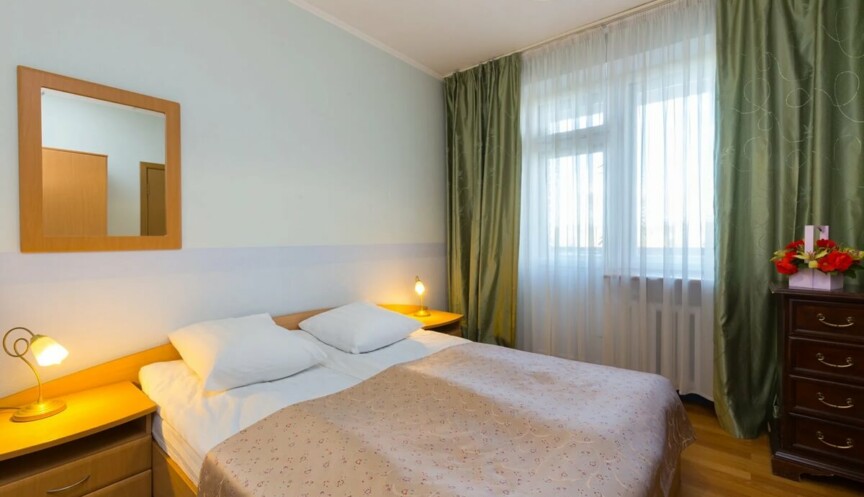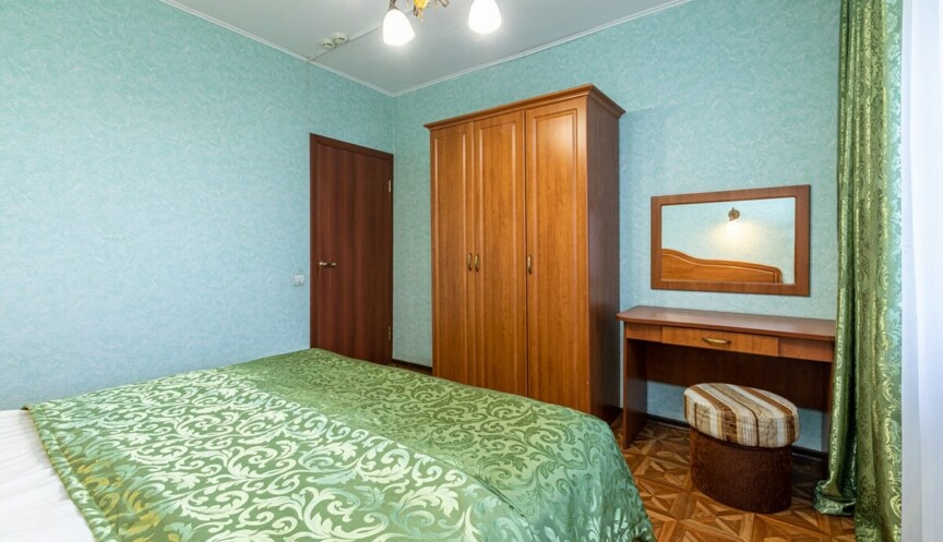 Трехкомнатный семейный номер, в основном корпусе. Размещение — до 6-ти человек. Оснащение — 2 двуспальные кровати, прикроватные тумбы, шкаф, стол, лоджия. Вид на Москва-реку. 5, 6, 9 этажи.