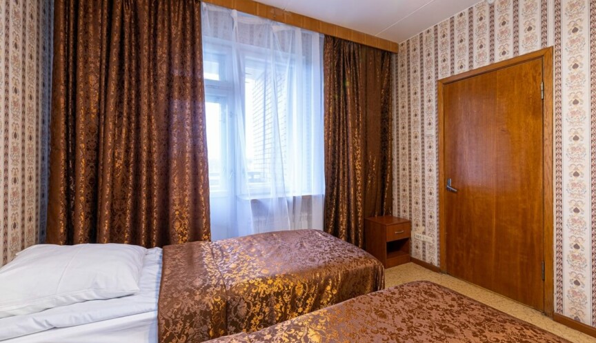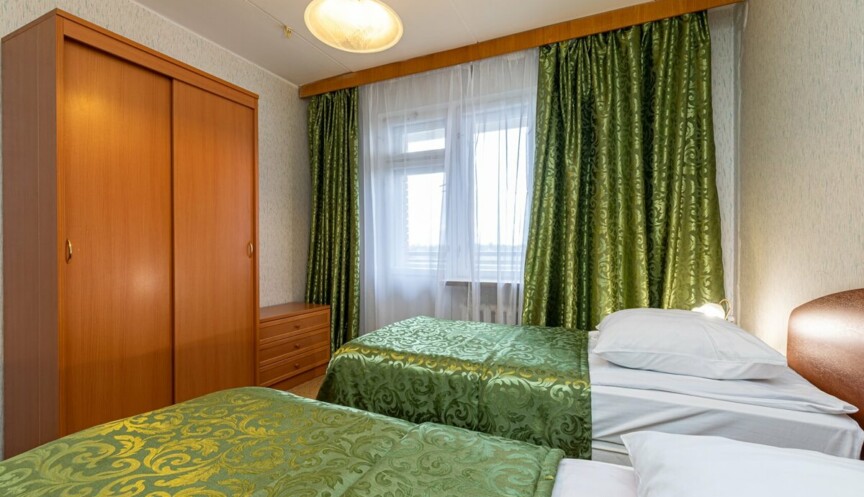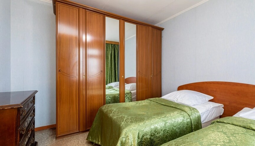 Трёхкомнатный номер расположен на 7,8 этаже, комфортное размещение 4-6 человек. Оснащение — 2 двуспальные кровати, прикроватные тумбы, шкаф, обеденный стол, лоджия