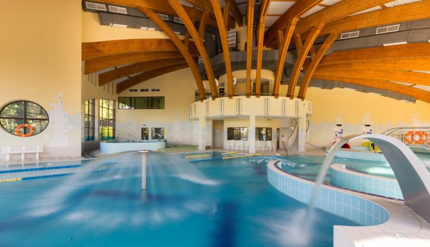 Большой бассейн (2 дорожки) подходит для свободного плавания, индивидуальных или групповых занятий и водных видов спорта. Для детей есть отдельная зона с неглубоким бассейном, фонтаном и гейзером. Для детей помладше есть ручей и мини-бассейн. Бассейн аквапарка разделен на несколько частей:
